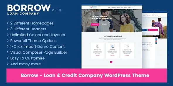 Borrow – Loan Company Responsive WordPress Theme is built with Visual Composer and tailored specifically for loan companies, banks, mutual funds, credit card providers, cryptocurrency advisors, and financial consultants. Its clean, creative design ensures your website looks professional while remaining user‑friendly and search engine optimized.